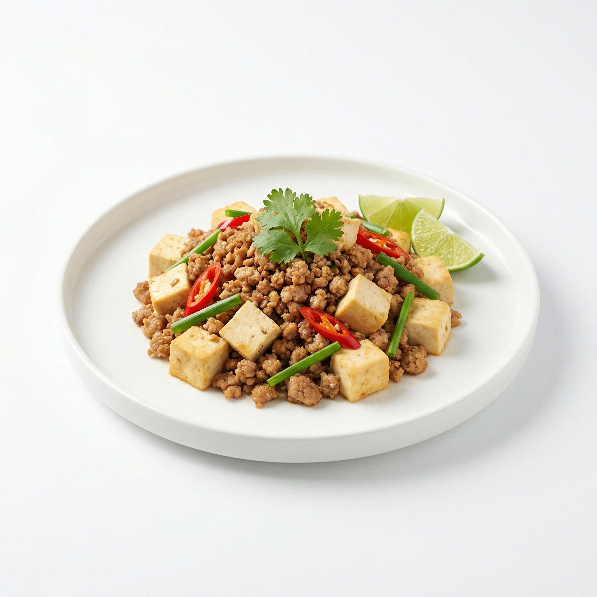 Minced Pork Tofu Stir-Fry. High-protein recipe with 27g protein, ready in 20 minutes. A homestyle stir-fry of minced pork and tofu with soft texture and savory flavor.
