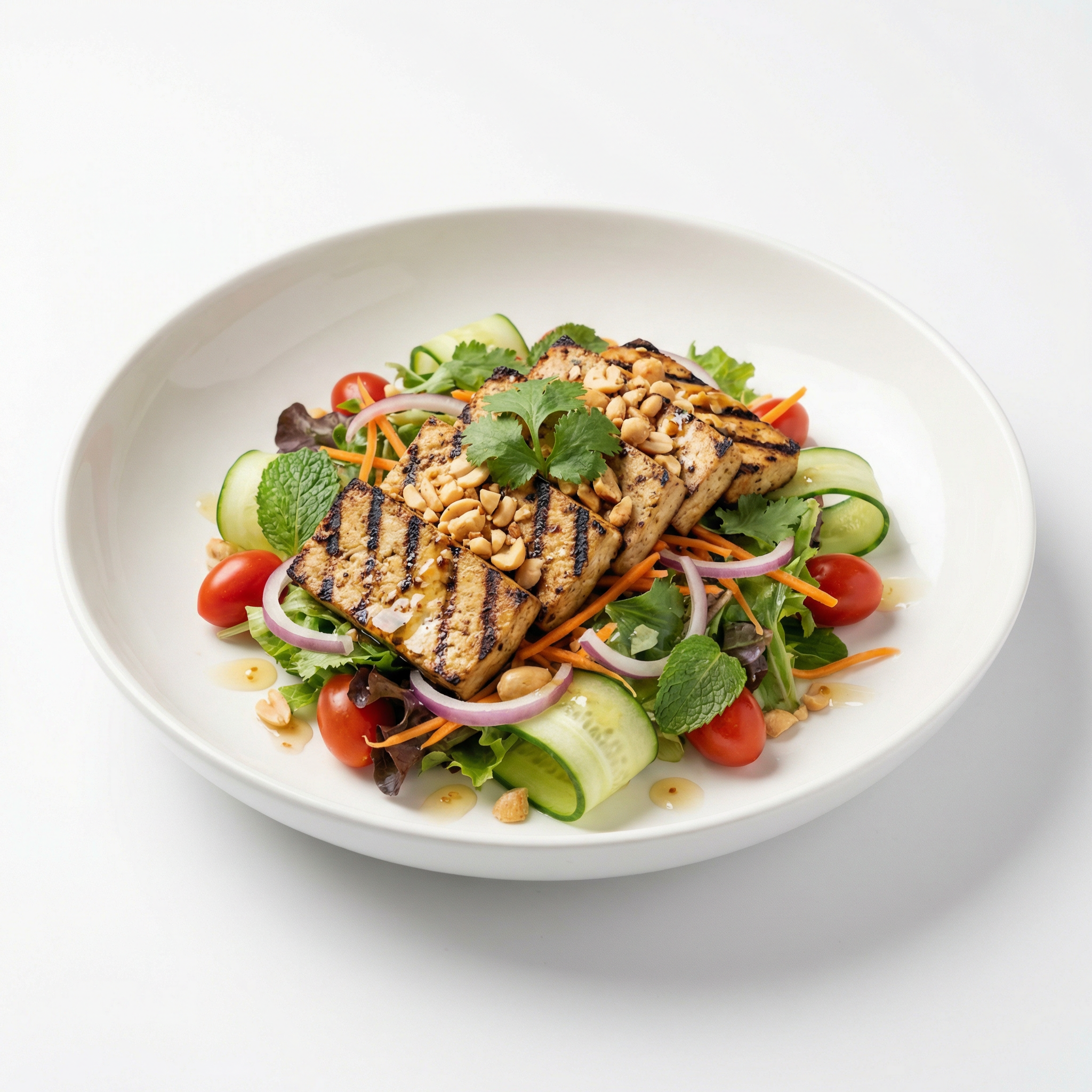 This grilled tofu salad has about 210 calories per serving with 15g of protein, making it useful for balanced meal planning.