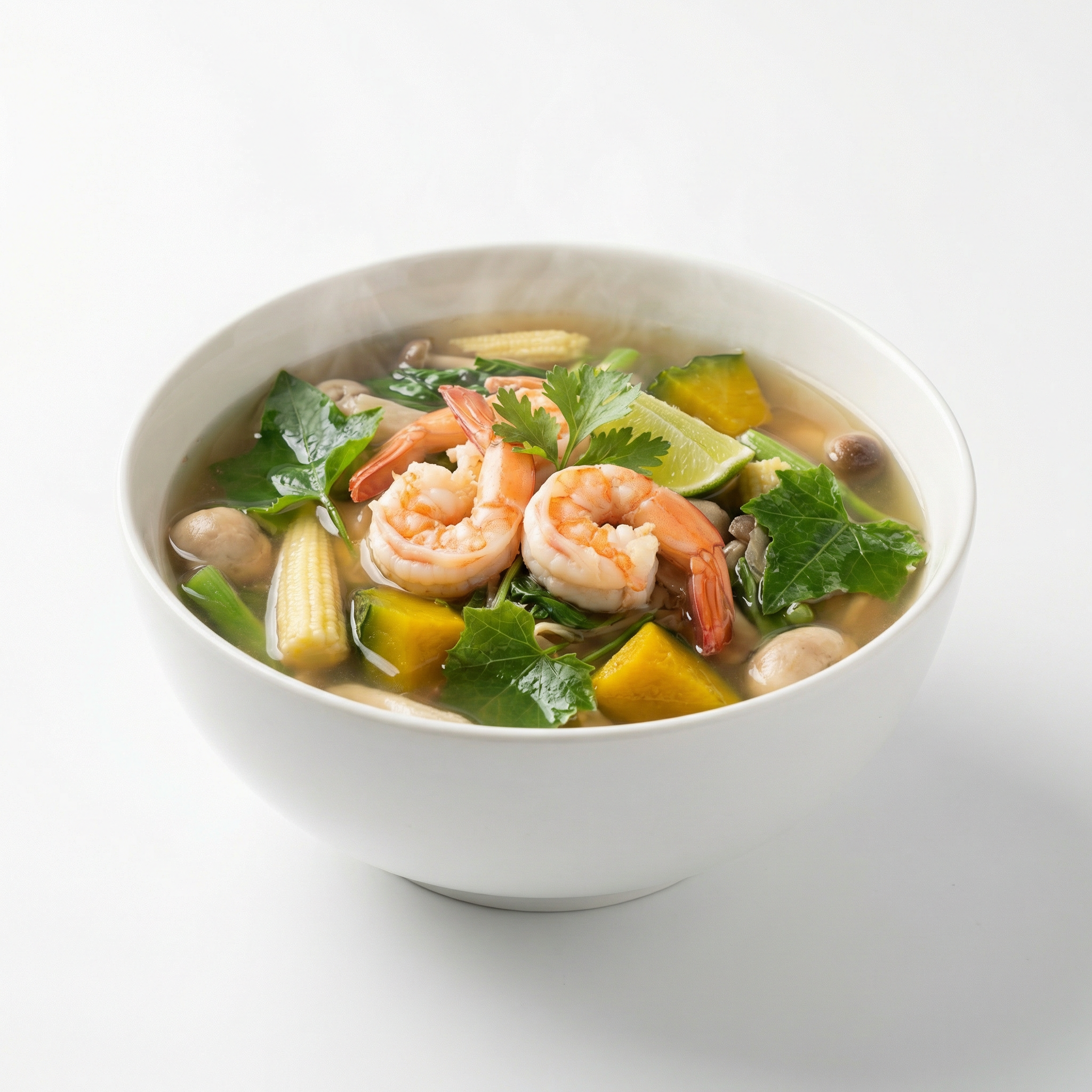 แกงเลียงกุ้งสดสูตรโปรตีนสูง โปรตีน 20 กรัม ประมาณ 160 แคลอรี่ แกงเลียงกุ้งสดหอมพริกไทยและสมุนไพร ผักเยอะ ซุปร้อนคล่องคอ