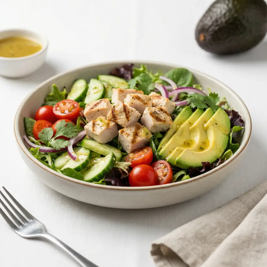 สลัดอกไก่อะโวคาโดเป็นสูตรโปรตีนสูงที่ทำตามได้จริง ให้พลังงานประมาณ 275 แคลอรี่ และโปรตีน 38 กรัมต่อเสิร์ฟ เหมาะกับคนที่อยากกินอร่อยพร้อมคุมเป้าหมายโภชนาการ