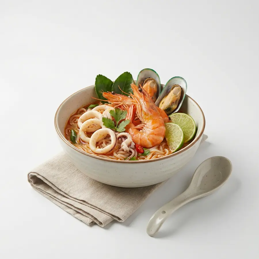 จัด เส้นบุกผัดต้มยำทะเล ลงจานและเสิร์ฟทันทีเพื่อให้รสชาติสดที่สุด